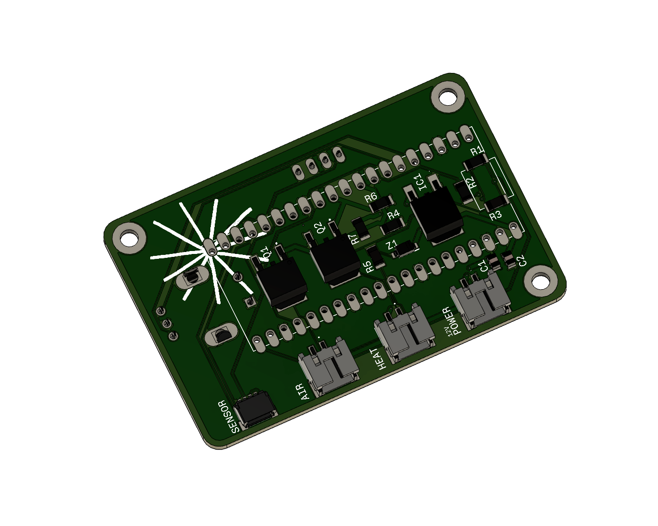 - Connectors for the power supply, fan, heating pad and sensor at the front. This allows easy access to connect and disconnect inputs/outputs as required, even when fully assembled.