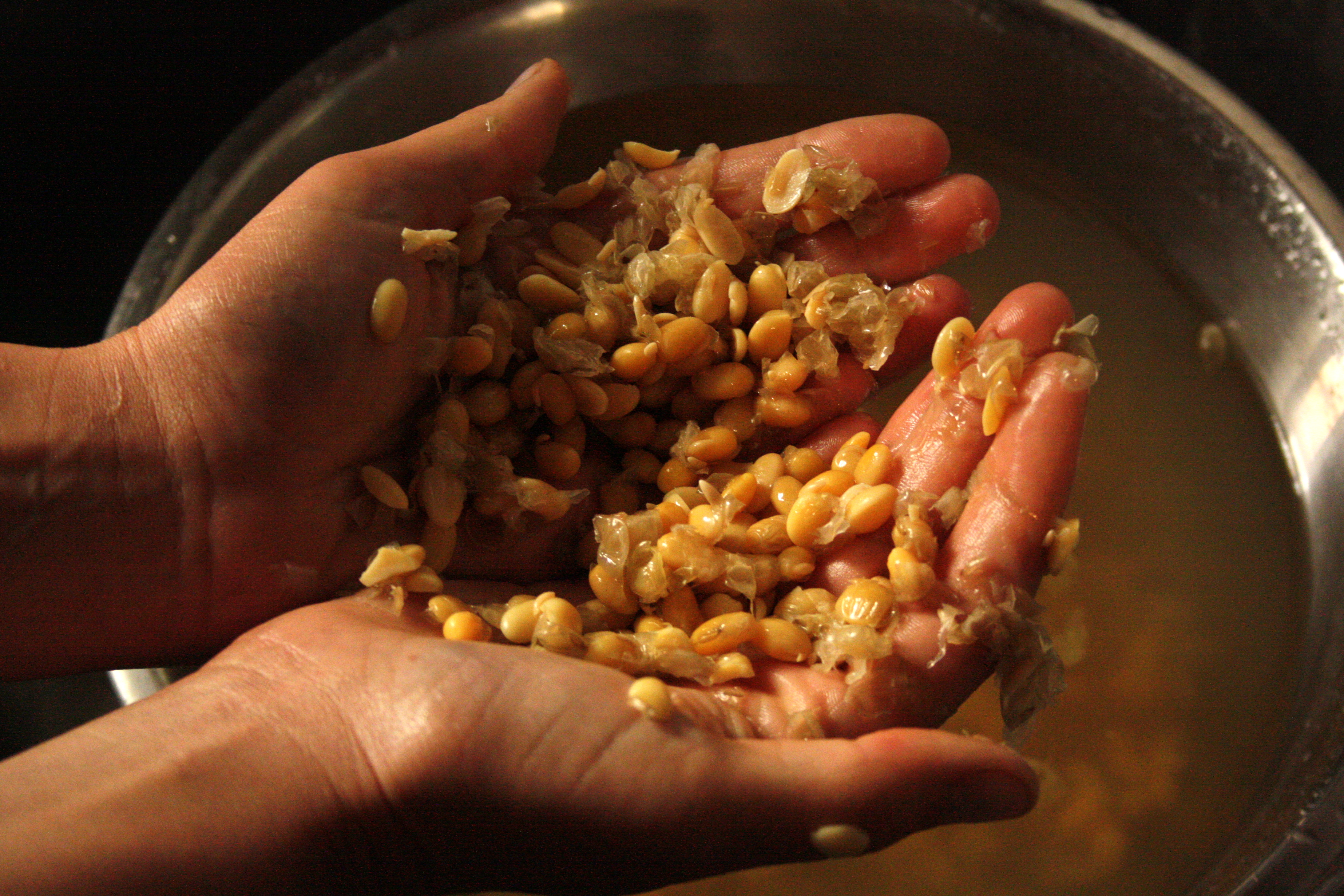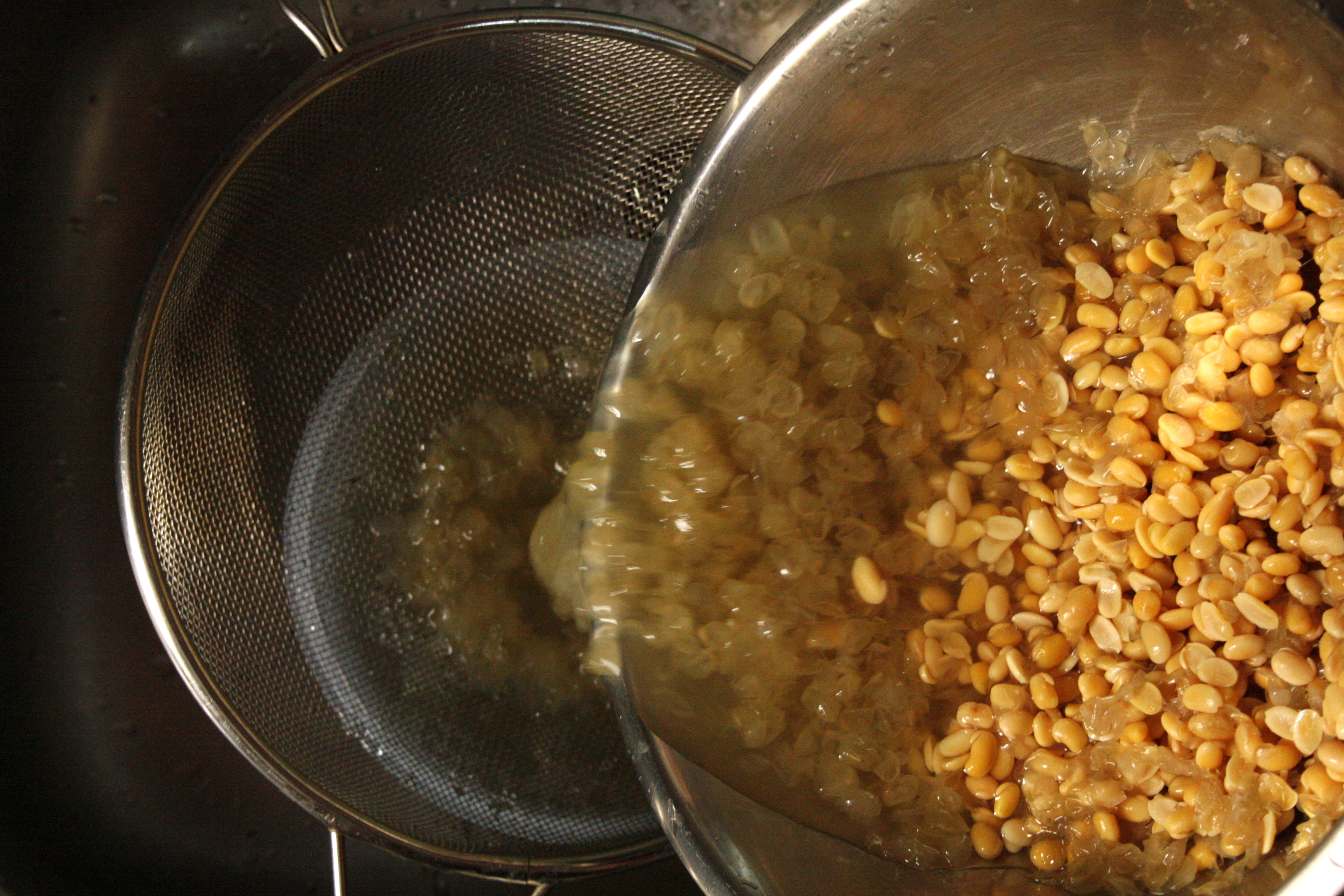 If you are working with whole soybeans or chickpeas, the first step is to dehull them. Indeed the hulls of those beans are a formidable barriers that the mycelium can not traverse to access the nutrients. If you want to avoid this step, there are split soybeans or “chaka dal” chickpeas on the market where the bean hulls have already been removed. It will definitely save you time