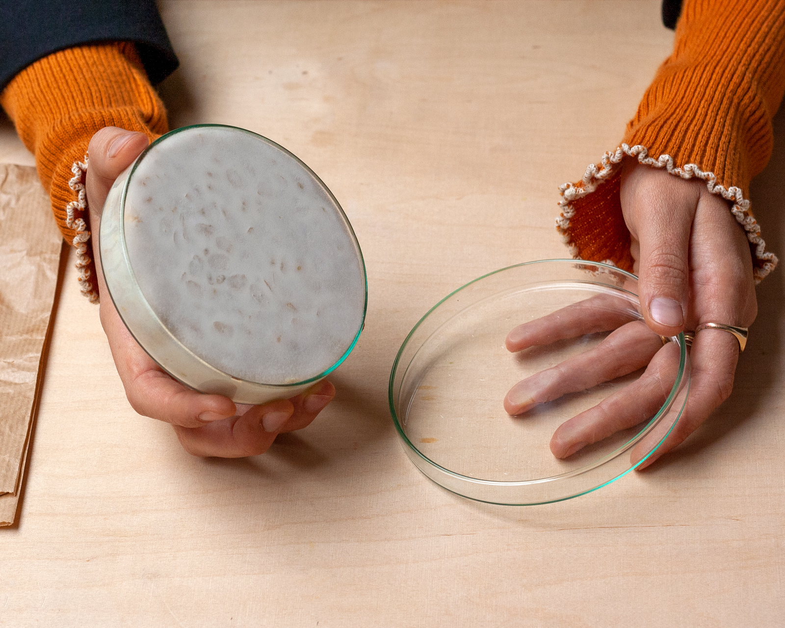 We are now also using glass petri dishes to make nice round tempeh burgers of about 100gr. The petri dishes are designed and optimised for any culture, with good sealing, ventilation, heat dissipation and easy cleaning. We highly recommend their use and sell some on our e-shop.