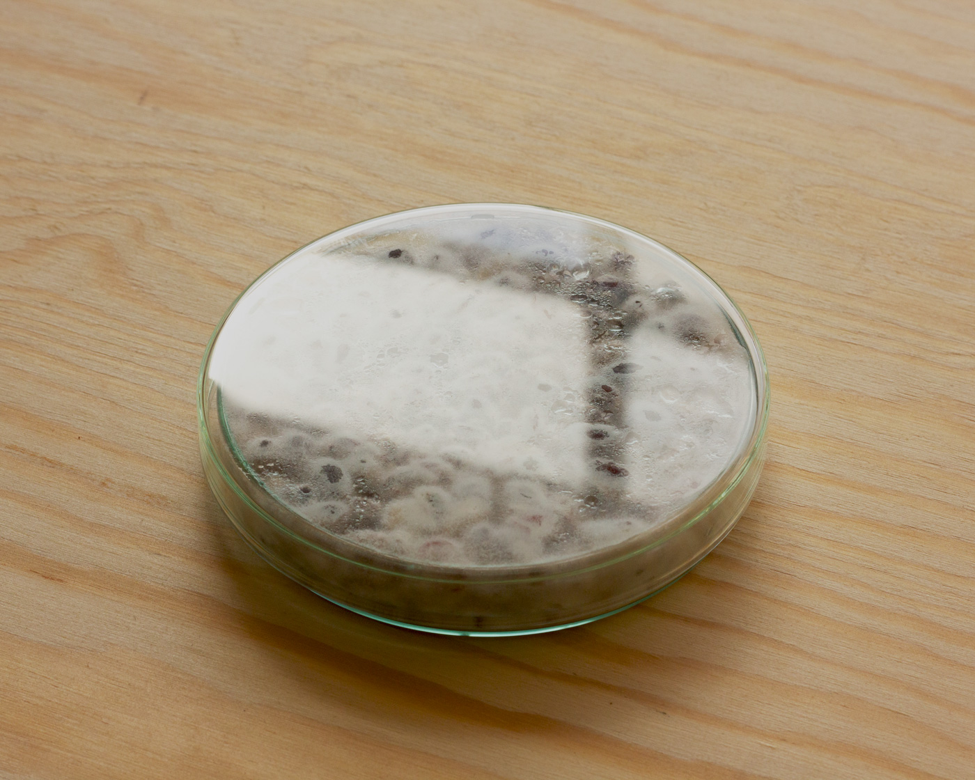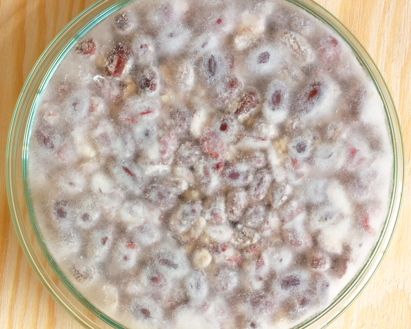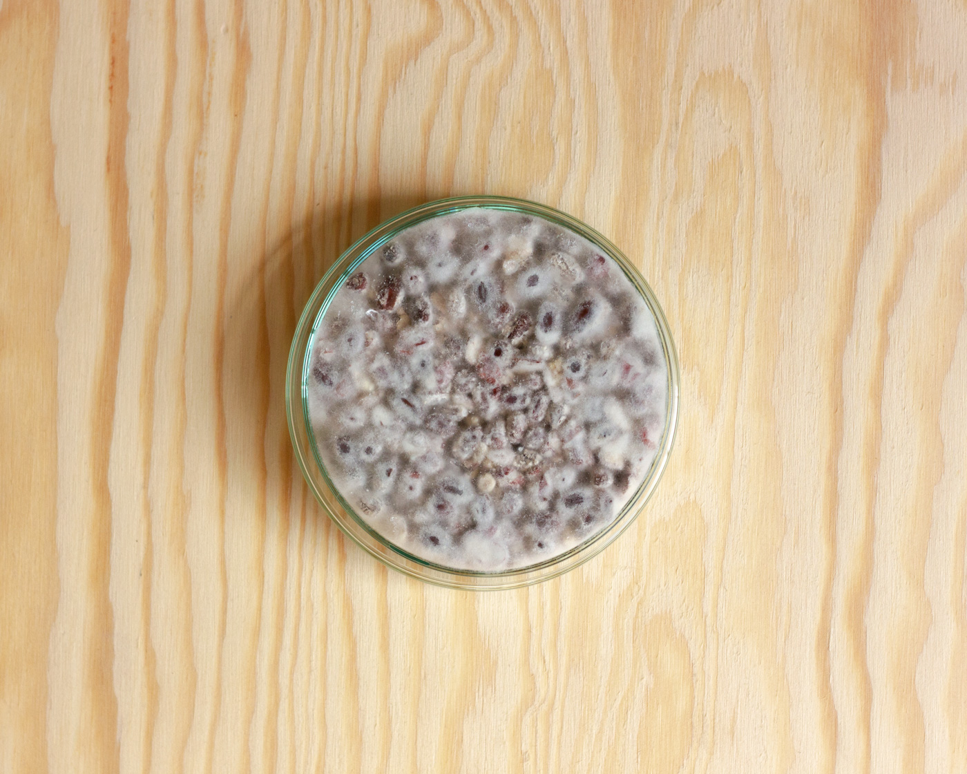 Intermediate phase of the fermentation of a tempe(h), from adzuki beans in this case. When the mycelium, the roots of the fungi, have started to colonise the beans, but not yet completely. The tips of their branches start to touch, to connect. The mycelial network starts to feed on the beans, sharing its nutrients, breaking them down into smaller bits.
